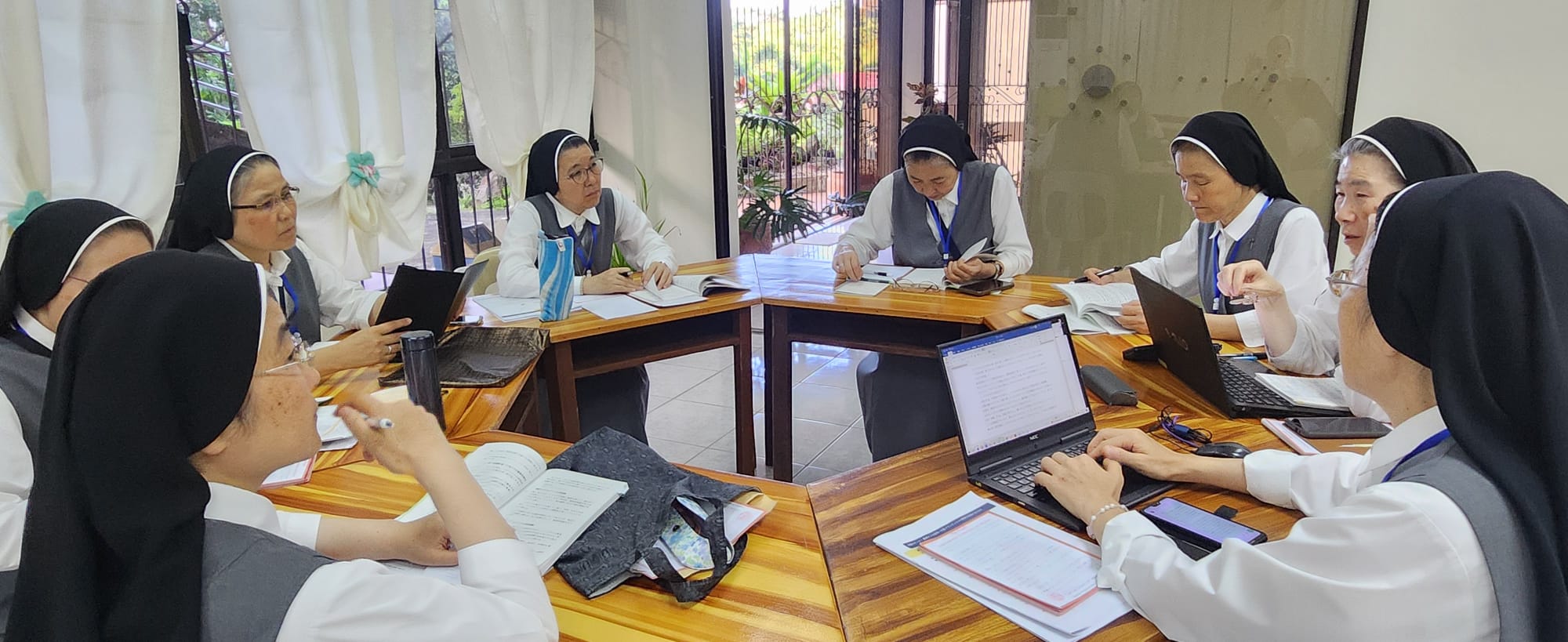 各管区の管区長、宣教担当評議員をはじめ、主に教育の現場に携わっている姉妹たちが11か国から39名(総本部メンバーやスタッフを含む)集まりました。テーマは、「教育による変革への道」で、教育とフランチェスコの経済に関する教皇フランシスコの考えに基づき、私たちの使命を再評価し、適応させるための学び・体験・ワークショップなどを行いました。